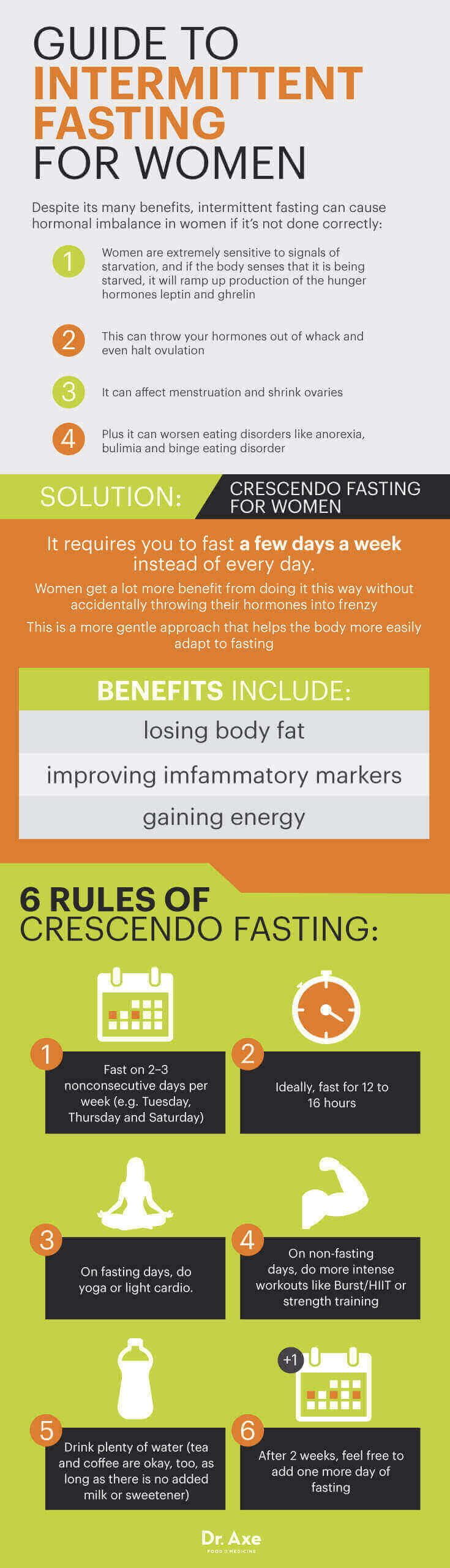 crescendo fasting นั้นให้คุณอดเพียงไม่กี่วันต่อสัปดาห์แทนที่จะอดทุกๆ วัน ประสบการณ์ส่วนตัวของ Dr.Shah ผู้หญิงจะได้ประโยชน์จากการอดแบบนี้โดยที่ไม่ทำให้ระดับฮอร์โมนสับสนและวุ่นวาย นี่เป็นวิธีที่ช่วยให้ร่างกายค่อยๆ ปรับตัวและร่างกายเข้าสู่การอดอาหาร นอกจากนี้หากคุณทำได้ถูกต้องมันก็จะช่วยในการลดไขมัน ป้องกันอาการอักเสบต่างๆ ในร่างกาย รวมถึงรู้สึกถึงมีพลังมากขึ้น